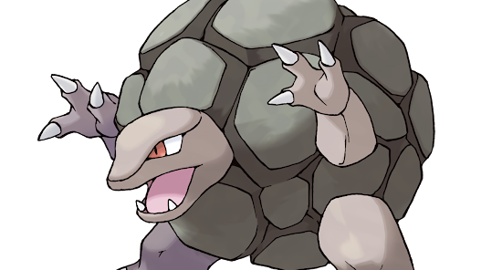 Golem, the Megaton Pokémon, and the final evolved form of Geodude. Geodude, in a stark difference to its pre-evolved forms, has a head instead of a face on the rock that is its body, where its limbs are also now independent of the rock. Golem is capable of enduring blasts of dynamite, shrugging them off like they’re nothing, and have a tendency to roll down the mountains it lives on, requiring humans to make indents to make sure it doesn’t crash into anything on its way down. It can also jump from mountain to mountain by using Self-Destruct or Explosion. Kantonian Golem can be found in Kanto, Johto, Hoeen, Sinnoh, Unova (Until Challenger’s Cave collapsed. The Kantonian Geodude line’s probably extinct in Unova.), Kalos, and Kitakami. Its best stat is its Defense while its worst stat is its Speed.